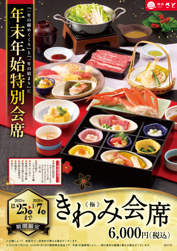 和食さとでは、12月25日(木)~1月7日(水)まで、年末年始特別会席「きわみ会席」を販売しています。
